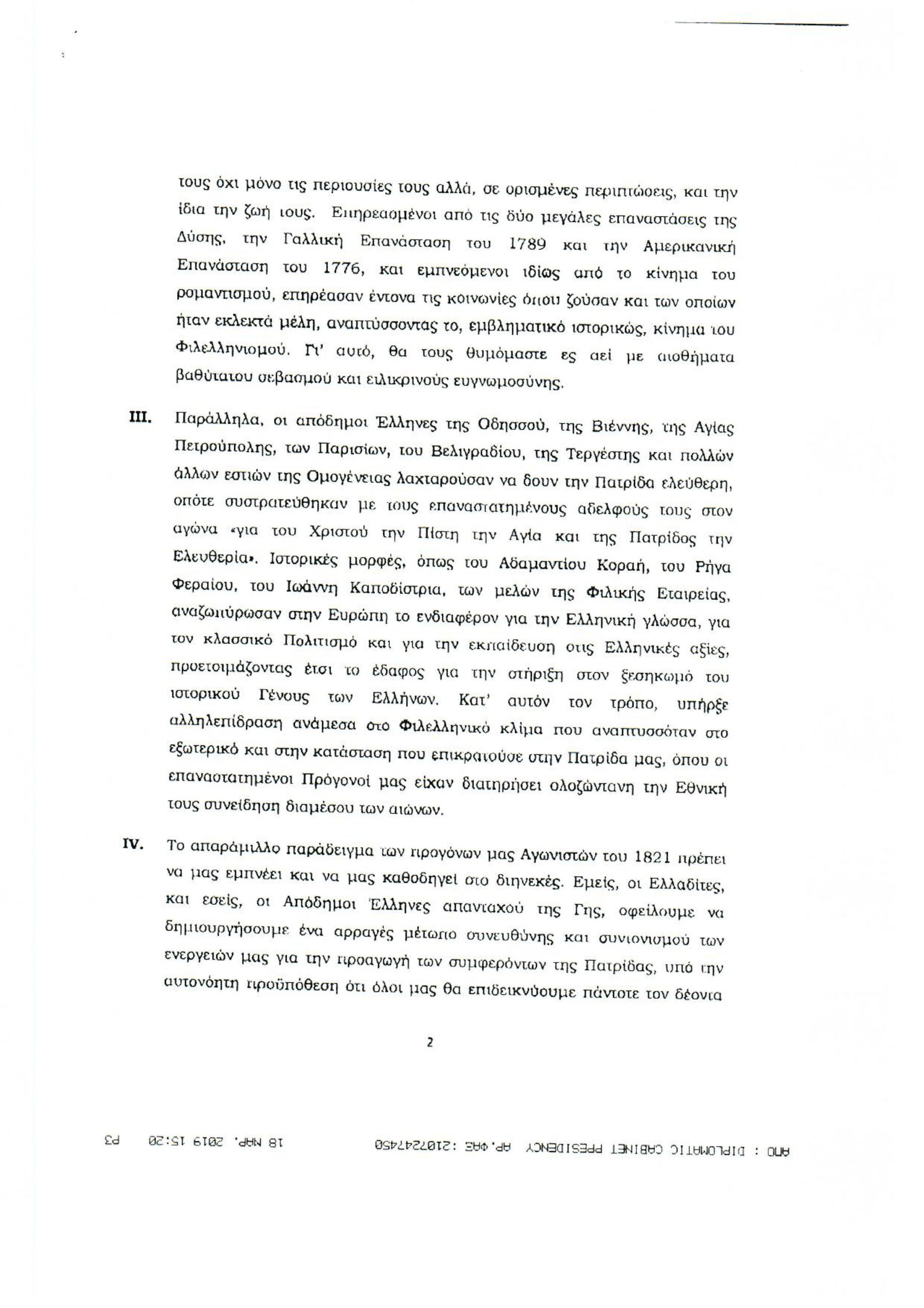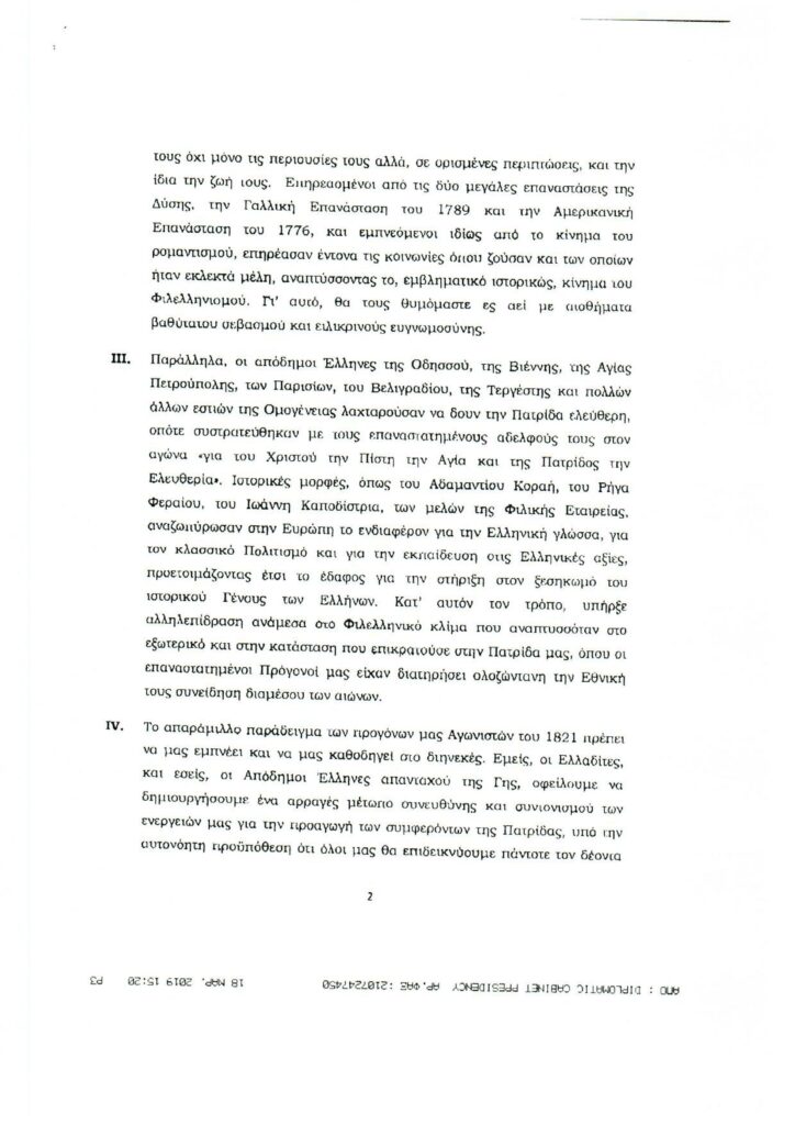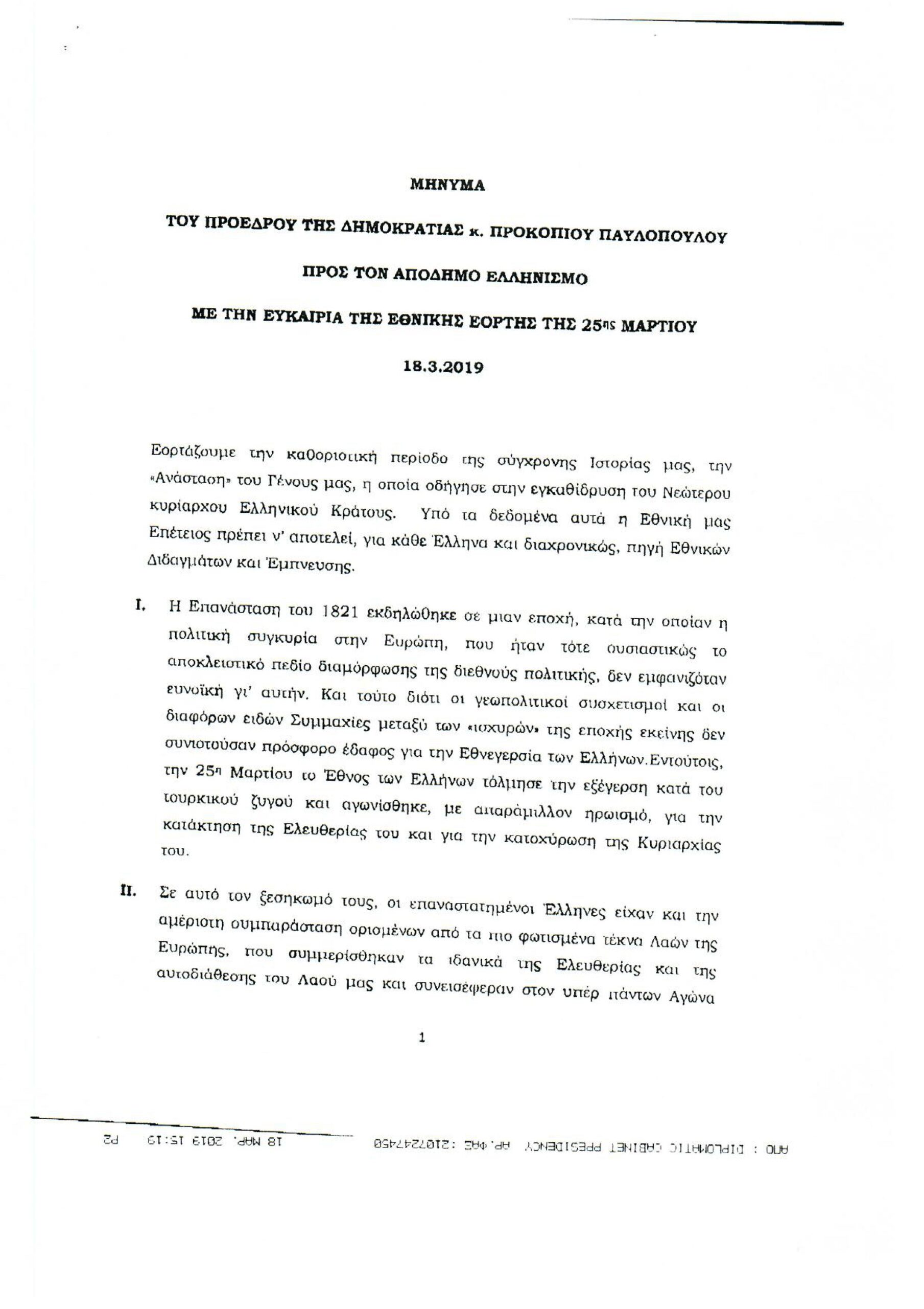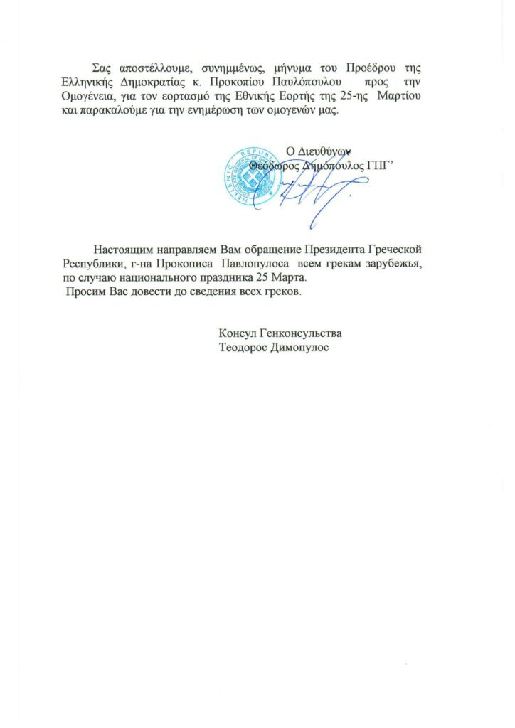 Обращение Президента Греческой Республики г-на Прокописа Павлопулоса ко всем грекам зарубежья, по случаю национального праздника 25 марта