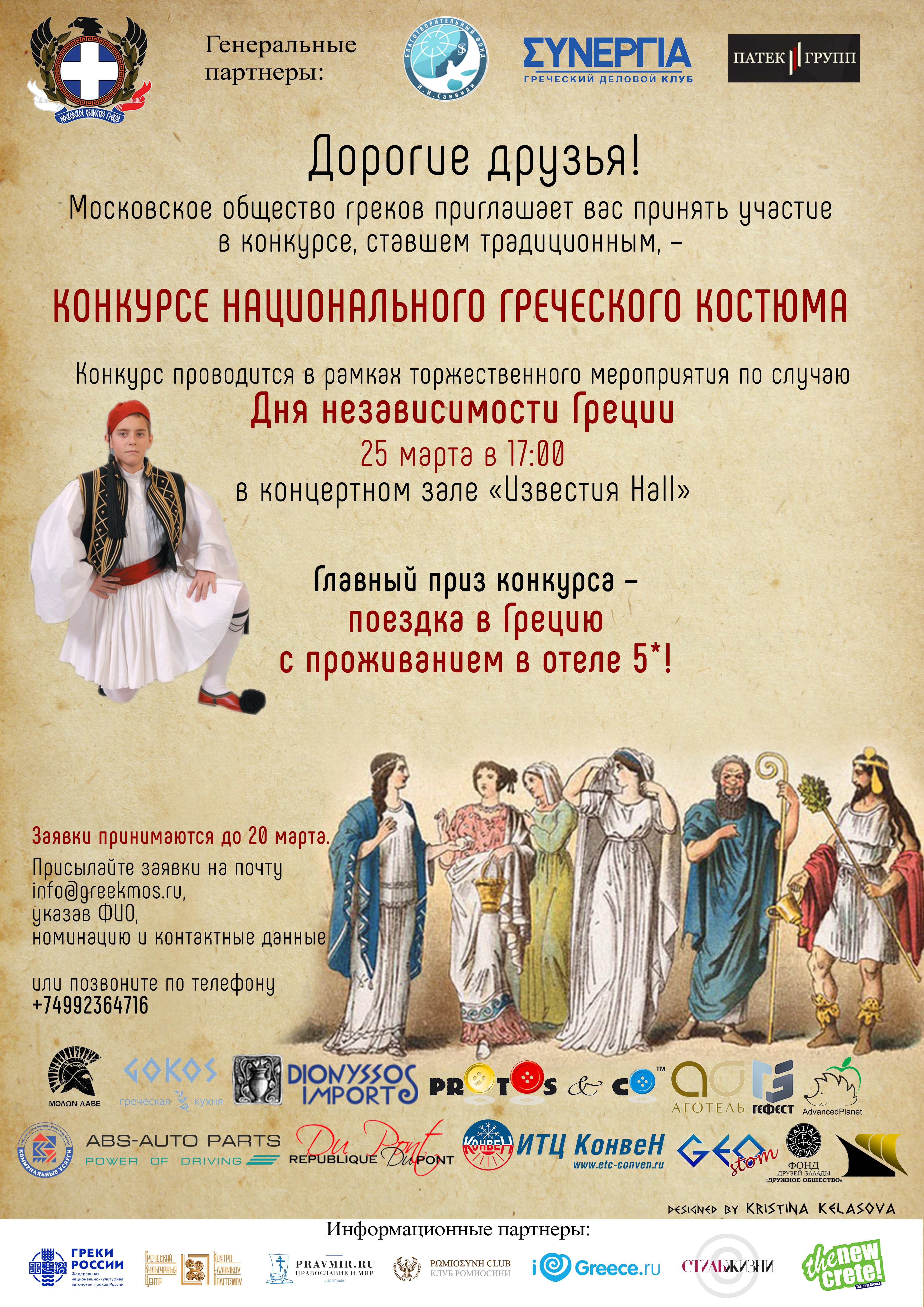 Конкурс греческого костюма проводится в рамках торжественного мероприятия по случаю Дня Независимости Греции, которое состоится 25 марта в концертном зале «Известия Холл» (ул.Тверская 18,стр.1).